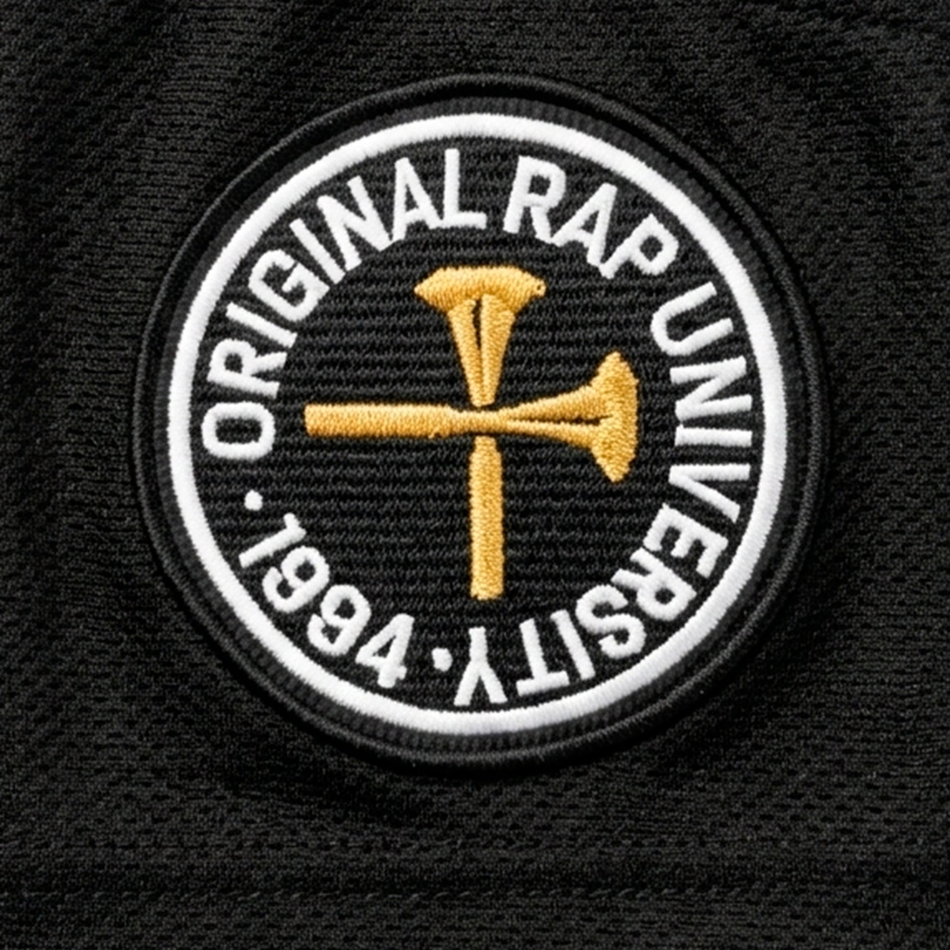 - Parche bordado en hombro: Original Rap University · 1994 con hilo metálico dorado